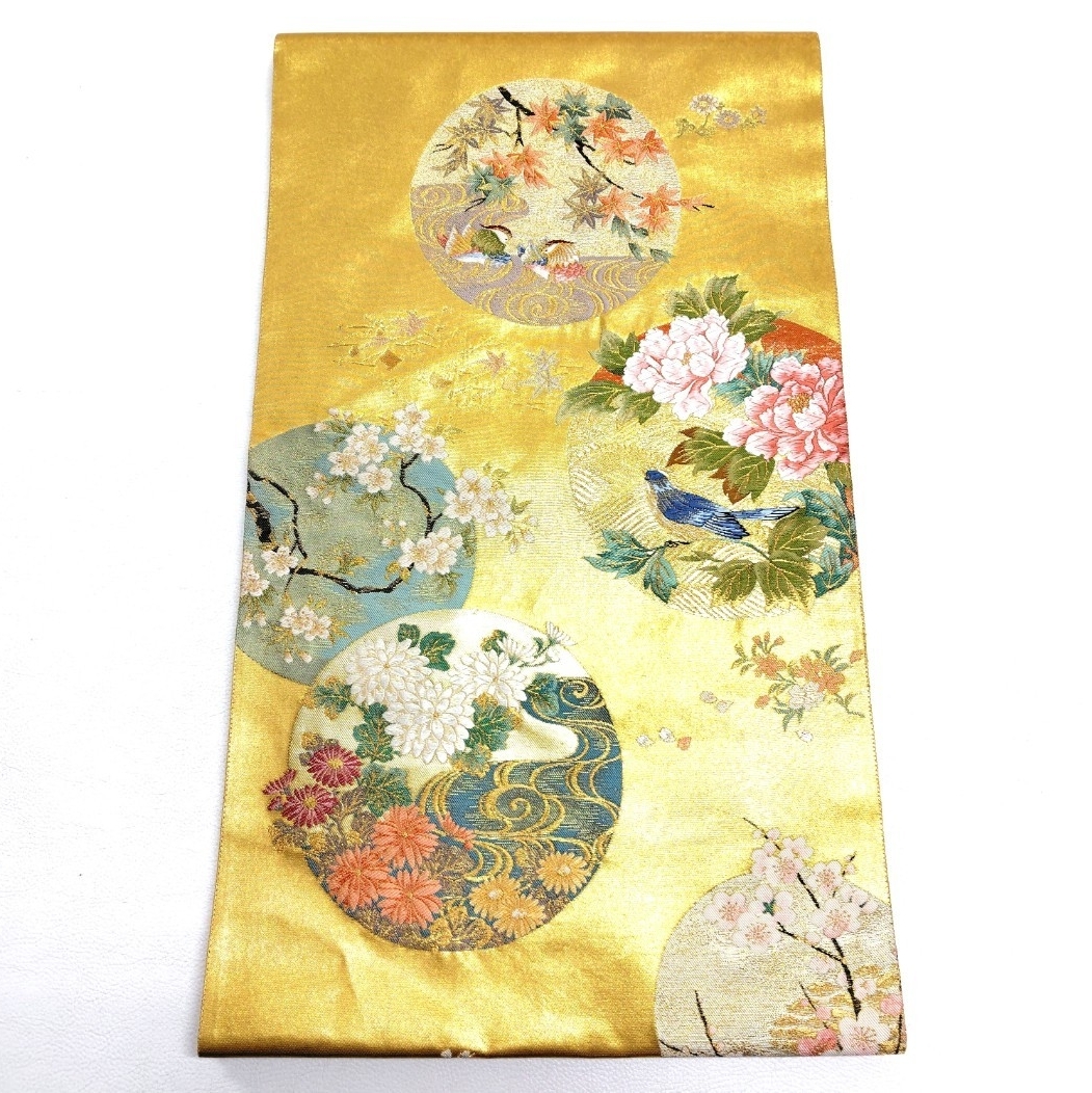 - 帯168 本金箔 秀麗花丸文 高級 正絹 太鼓六通 袋帯 牡丹 オシドリ hsufjac