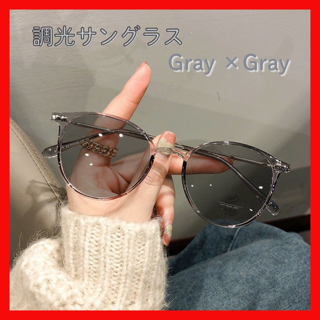 - グレー 調光 サングラス 伊達メガネ ボストン UVカット 紫外線