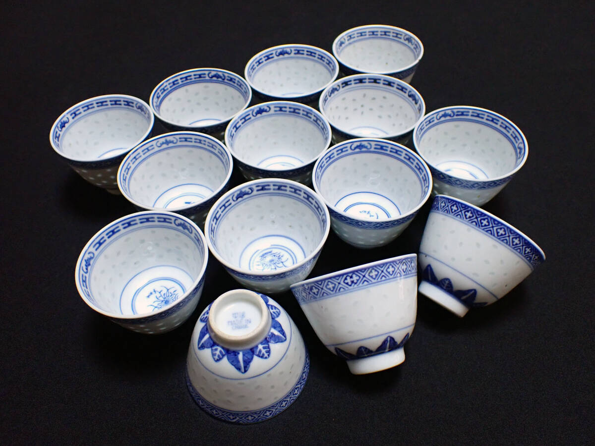 - 【近】時代 中国美術 景徳鎮 小ぶり 蛍焼 染付 茶碗 14客揃 中国古玩 唐物