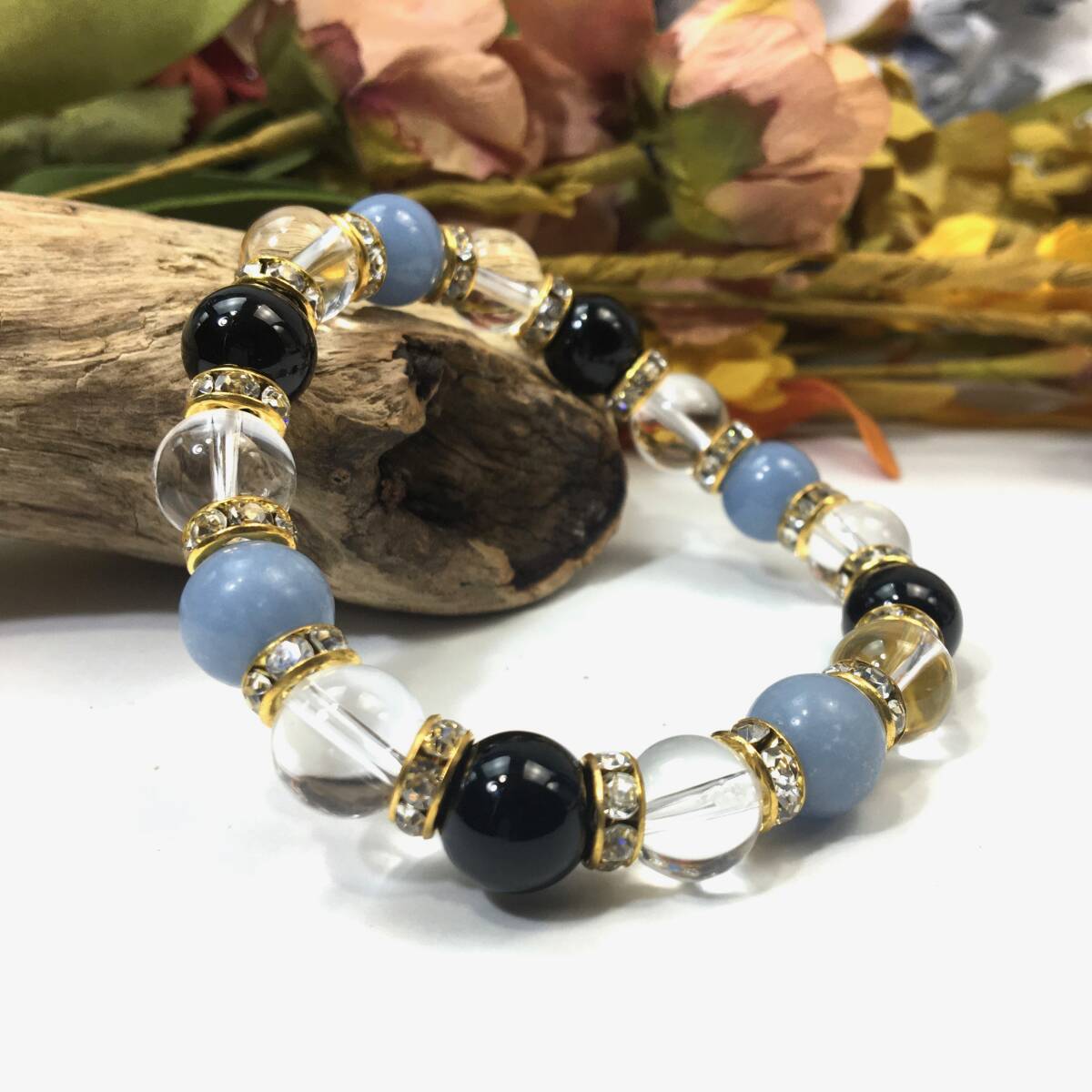 > エンジェライト×水晶×オニキス パワーストーン ブレスレット 天然石ブレス (ロンデル: ゴールド) 10mm メンズ・レディース