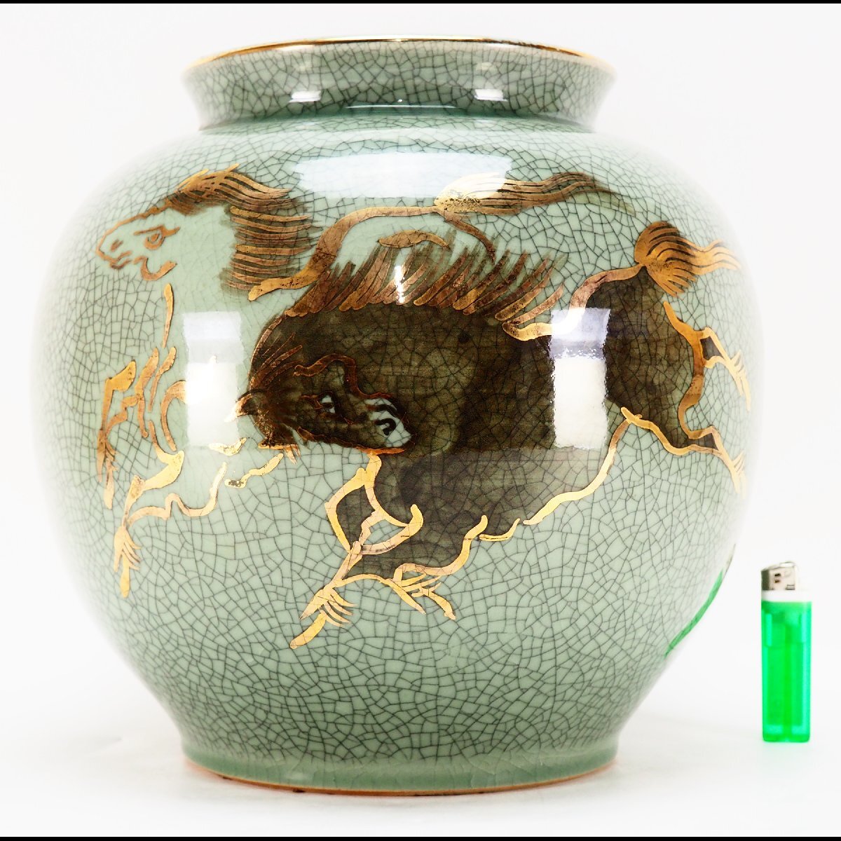 > 【治】時代相馬焼 大振り 金彩走駒紋壷☆幅 32cm 重さ 4251g オブジェ 花器 置物 相馬駒焼 花瓶 壷 花入 特大 BCA22