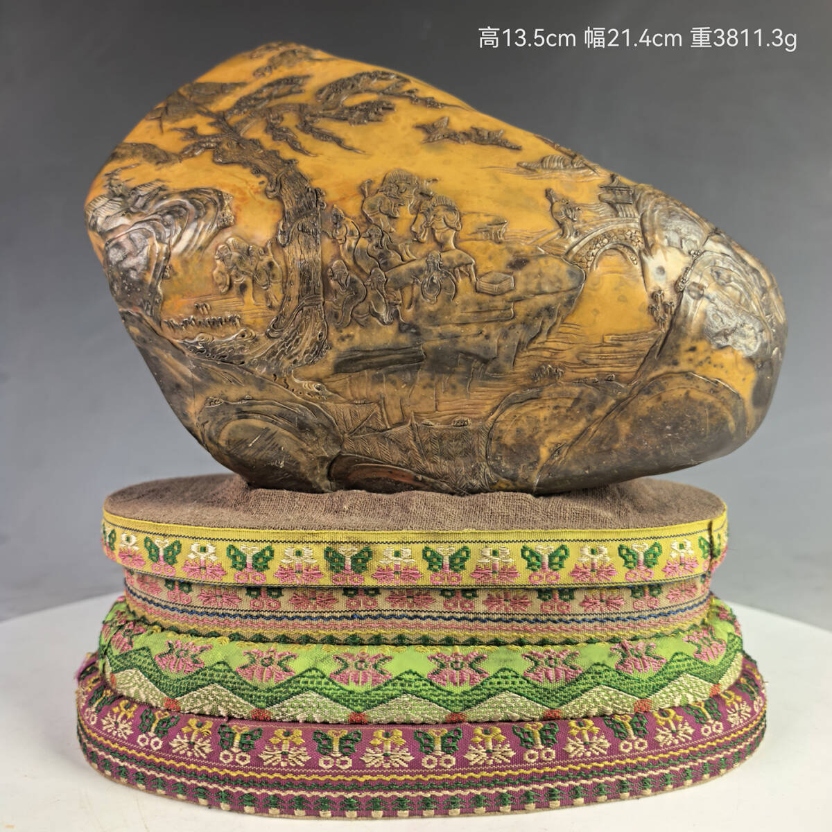 - 古石彫 寿山石 中国・清時代 【烏皮田黄石彫刻松下雅集図山子置物】 文房置物 台座付 古美術 古賞物 唐物 時代物 重3811.3g LT-2509171