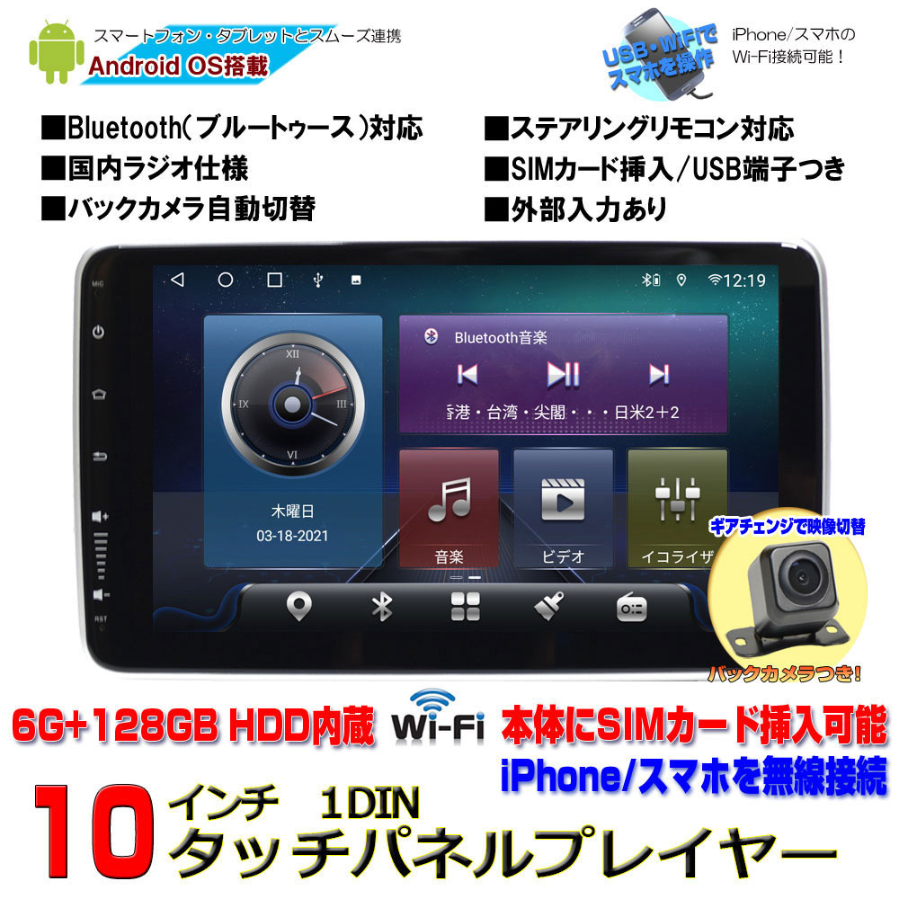 最新機種 車載カーナビ1DIN10インチタッチパネルプレイヤー Android10.0 + 170度バックカメラセット WiFi ラジオ USB Bluetooth