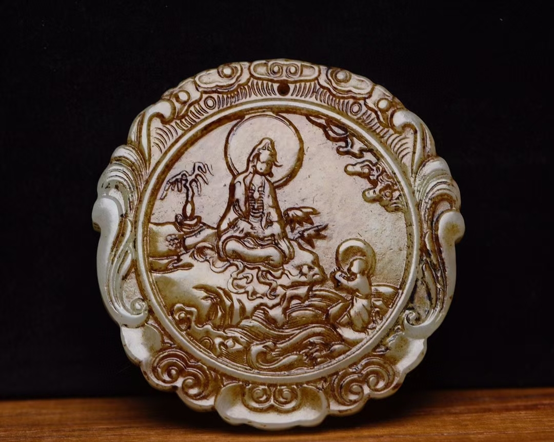 - 『館蔵珍品 和田玉製 細密彫 玉觀音 置物 賞物』文房具 書道品 貴重物品 収蔵品 中国古美術 時代物 古董品
