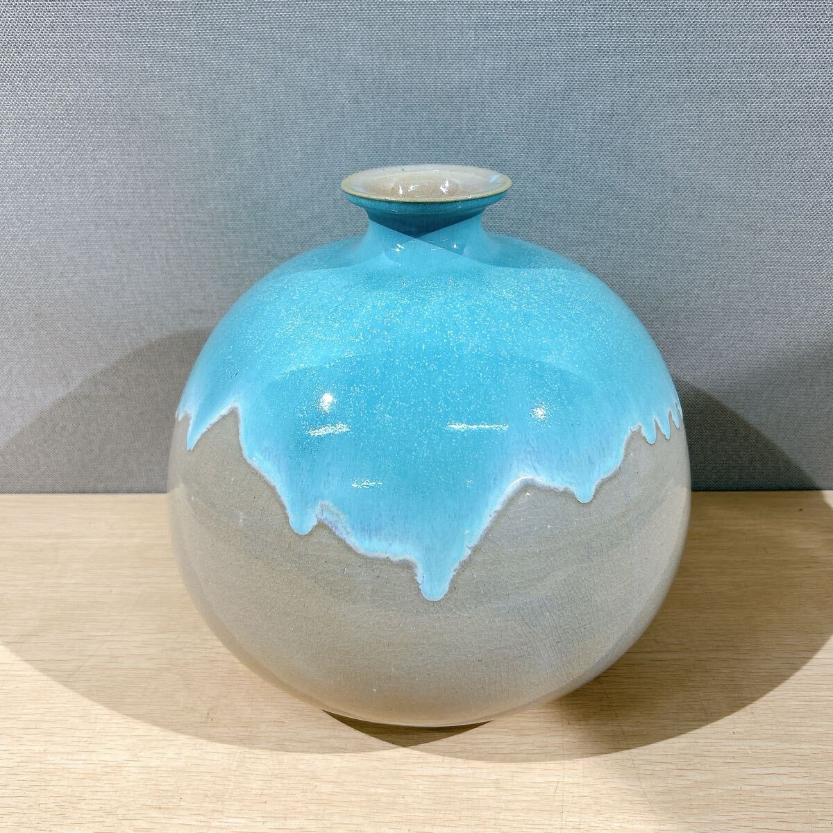 - ★花瓶 壺 花器 陶器 緑青流し 上野焼 三代 銘あり 口径8.5cm 高さ26.5cm 箱無し