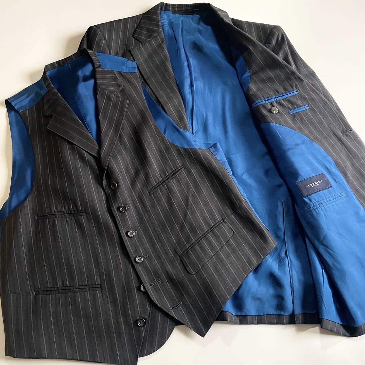 > BURBERRY LONDON バーバリーロンドン ウール 2ピース ジャケット&ジレ(ベスト) 裏地ブルー チャコールグレー ストライプ柄 BB5 L-XL相当