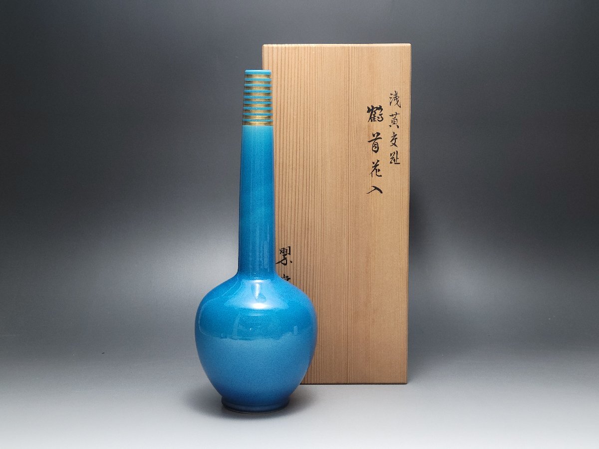 - A 翠嵐窯 中村翠嵐作 浅黄交趾 鶴首花入 共箱 高さ約26.5cm / 花瓶 飾瓶 花插 花器 唐物 人間国宝 李朝 高麗 古玩 古董