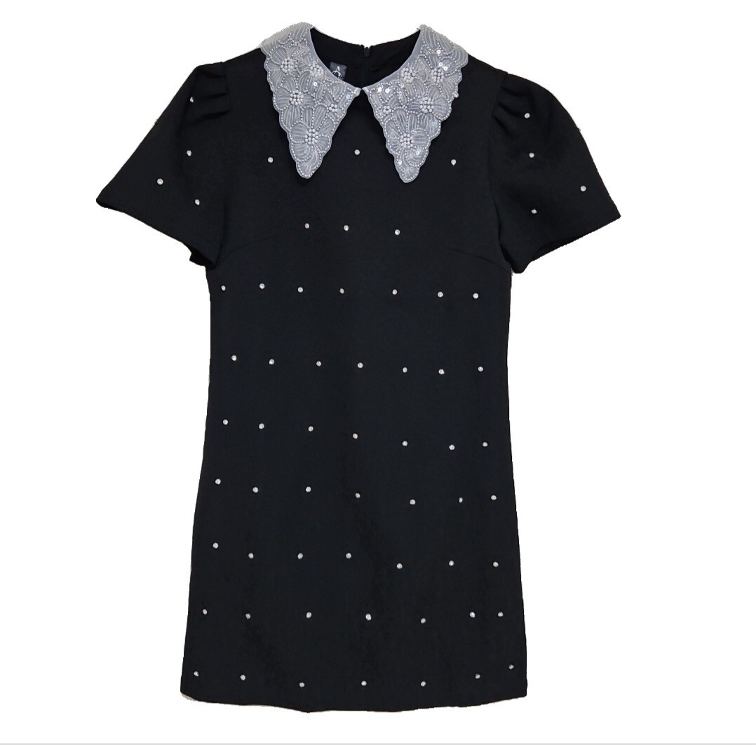 - ワンピース 半袖 ドット柄 レース襟 ミニ丈 ブラック