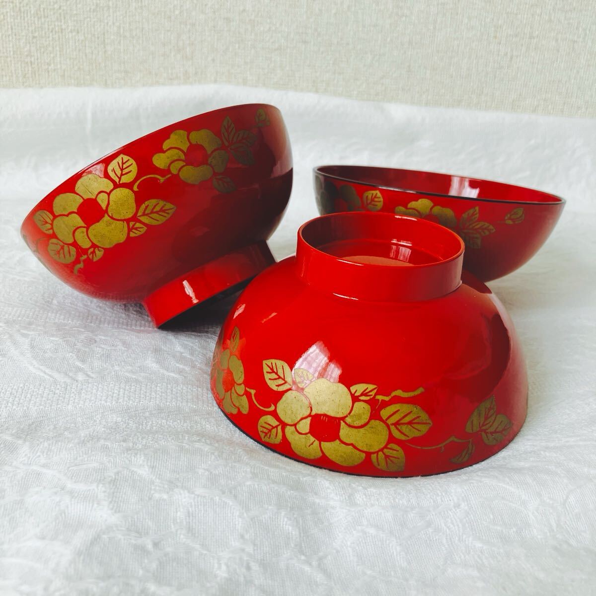 - m37)汁碗 椿 3客セット 味噌汁 吸い物 昭和 レトロ ビンテージ 食器 ヴィンテージ 皿
