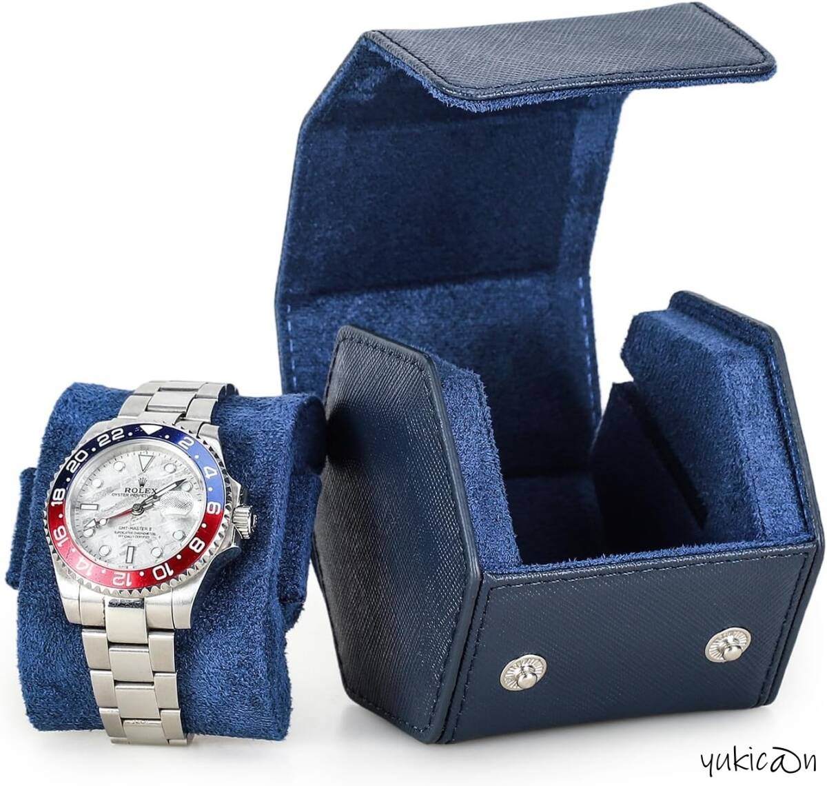 - 腕時計収納ケース 腕時計ロール ブルー 青 1本用 六角型レトロ 本革時計ケース インテリアレザー 時計携帯 旅行 出張 持運び 耐衝撃 ギフト