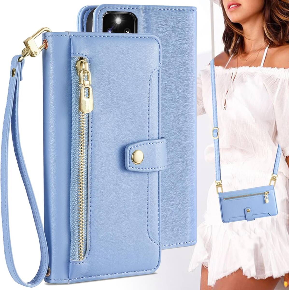 - Google pixel 4A 5G ケース 手帳型 ショルダー 適用【 ストラップ 長+短 2本】カードケース 斜め掛け スマホケース ライトブルー