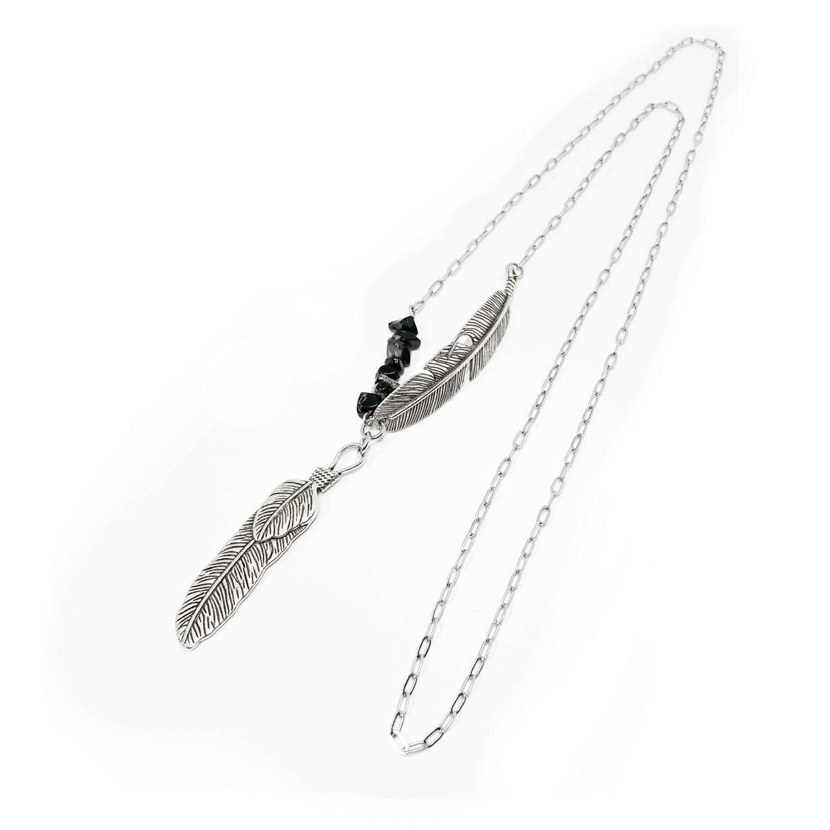 - 男女兼用 フェザーチャーム ロングネックレス オニキス約75cm NGF05