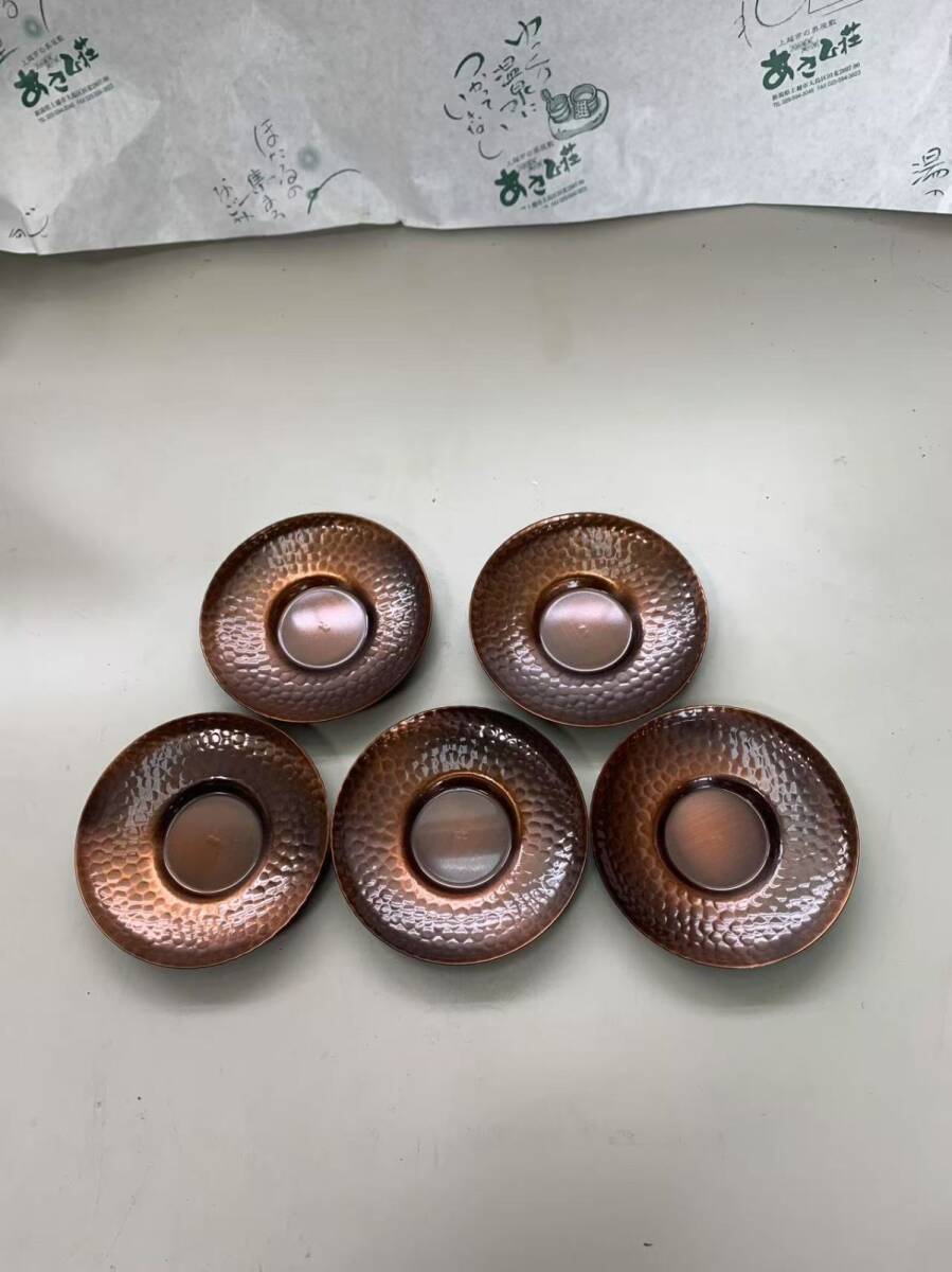 - G0605→銅製茶托・打ち出の小槌・5客 鎚起銅 今泉堂 在銘 鋲打銅製 鎚起銅器 茶道具 中古