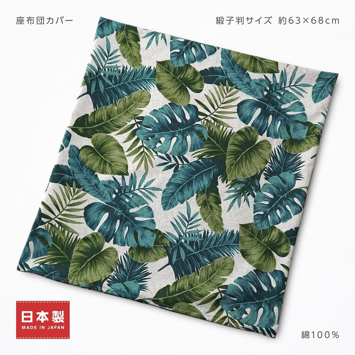 - 座布団カバー 約63×68cm 綿100% 日本製 緞子判 ハワイアンリーフ グリーン 座ぶとん ざぶとん クッション 北欧 ボタニカル 緑