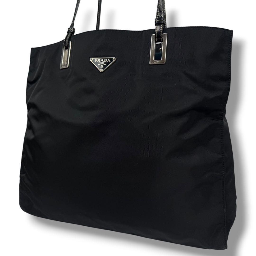 - 【A4対応/外観美品】PRADA プラダ 大容量 トート ハンド バッグ 手提げ 肩掛け カバン 三角ロゴプレート ナイロン 黒 ブラック 白タグ