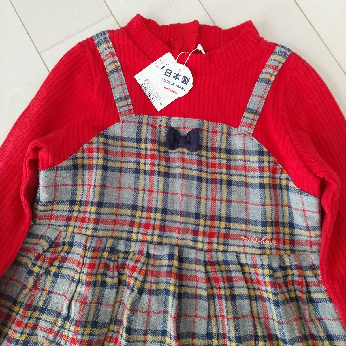> 120 新品タグ付き未使用 ミキハウス 重ね着風ワンピース 赤×グレーチェック 日本製