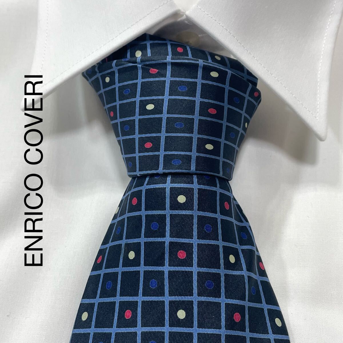- ENRICO COVERI エンリココベリ 格子 水玉 シルク ネクタイ イタリア製 ネイビー TG2920