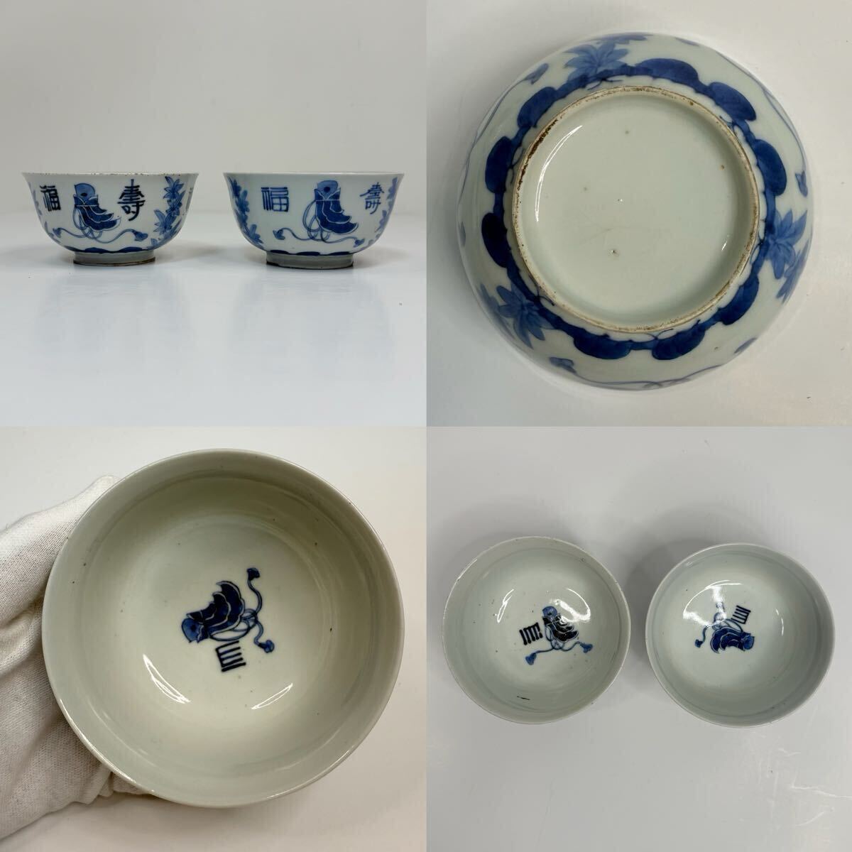 - XMF-中国古美術 時代物 染付 茶碗 茶道具 煎茶道具 福寿図 ハ宝図 ペア 唐物 陶磁器 中国古玩 骨董品 傷あり