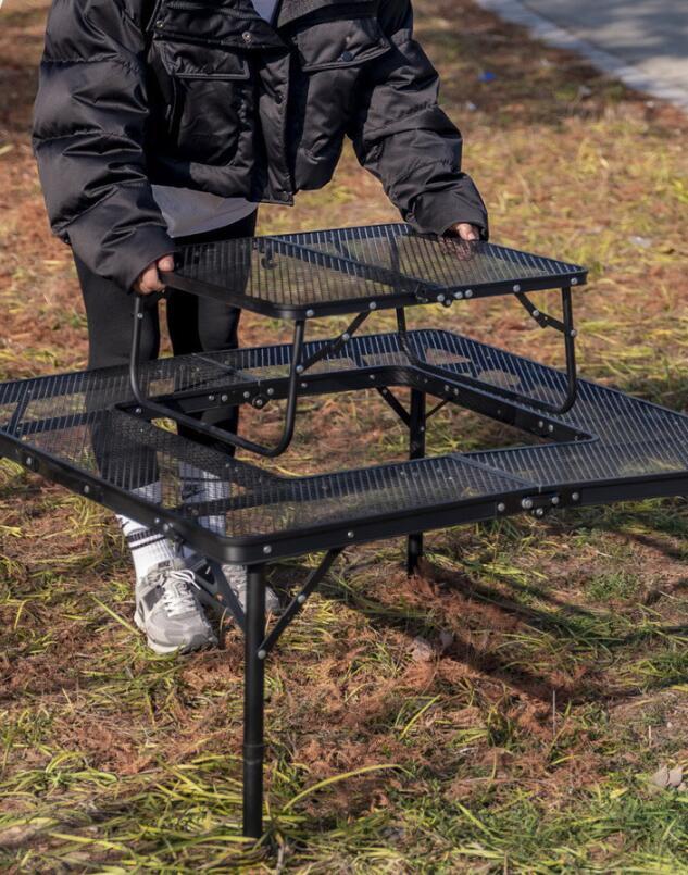 - 新作アイアン囲炉裏テーブル メッシュ 焚き火テーブル 着脱式センターテーブル付き 2つ折りコンパクト収納 BBQアウトドア ブラック