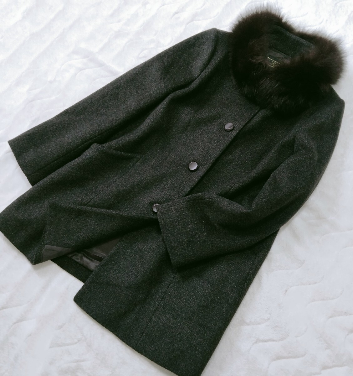 > Leilian*レリアン*カシミヤ100%×フォックスファー*ミドル丈コート*こげ茶*ダークブラウン*カシミア*スタンドカラー*まだら柄