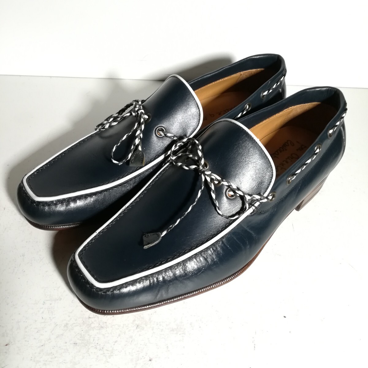 > d0214 【新品同様・試着程度】 ★エンツォボナフェ Enzo Bonafe★ リボンローファー スリッポン 8 ネイビー ドレスシューズ 革靴 本革