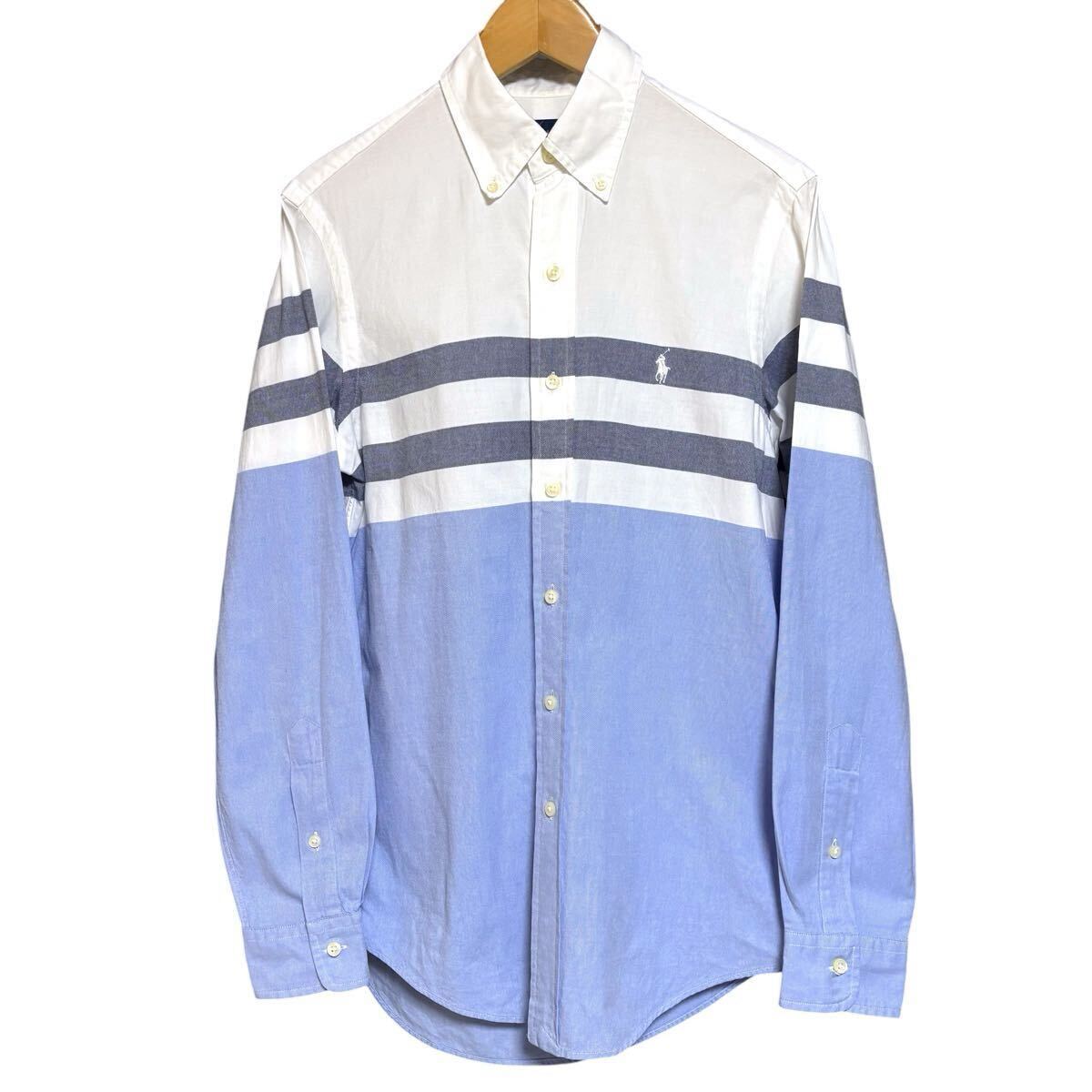 > ※KS RALPH LAUREN ラルフローレン 長袖ラベルシャツ ホワイト×ネイビー×ブルー ボーダー 綿100% メンズ サイズXS