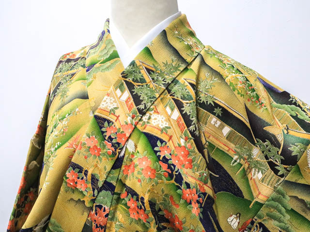 > 《京都一輝堂》【着物】小紋 ちりめん 古典人物 風景文 身丈約155cm 裄丈約61cm 25z01-363
