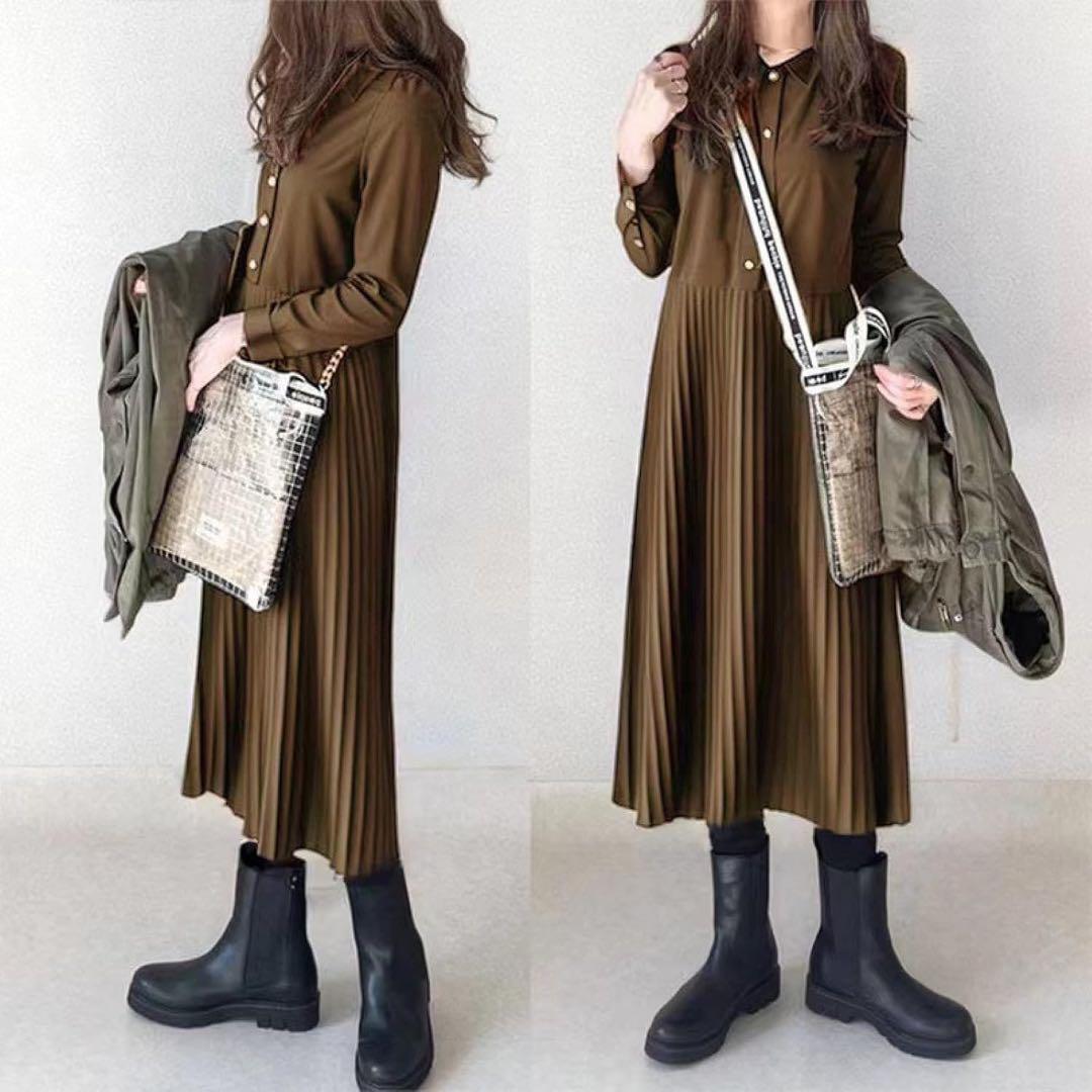 - L シャツワンピース 長袖 ロング上品 プリーツ Aライン 着痩せ 茶色 体型カバー おしゃれ 可愛い 新作
