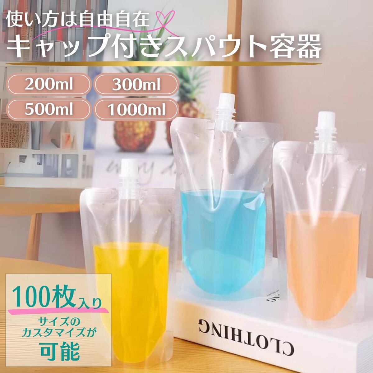 - 100枚 ロックキャップ式 スタンドスパウトパウチ 200-1000ml 詰め替え容器 液体容器 レフィール 保存容器 詰替え容器 カウパック