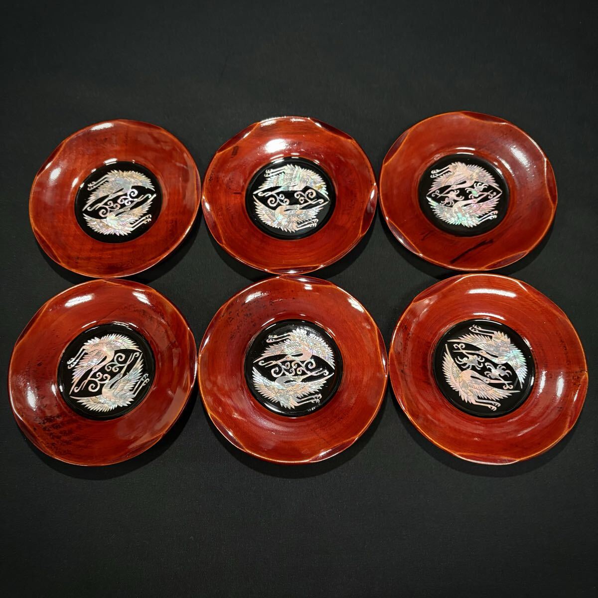 韓国 螺鈿 瑞鳥文 木製 茶托 6客セット 茶器 漆器 漆芸 煎茶道具 朝鮮美術 美品 (09047T