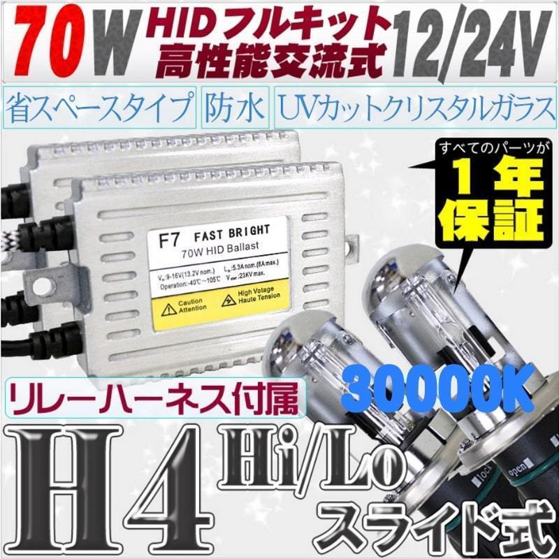 > 高性能 薄型HIDキット 70W H4 Hi/Lo スライド式 リレー、キャンセラー付 30000K 12V/24V 【交流式バラスト&クリスタルガラスバーナー】