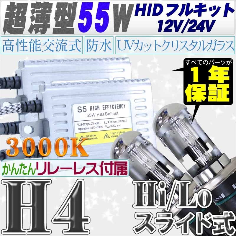 - 高性能 薄型HIDキット 55W H4 Hi/Lo スライド式 リレー、キャンセラー付 3000K 12V/24V 【交流式バラスト&クリスタルガラスバーナー】