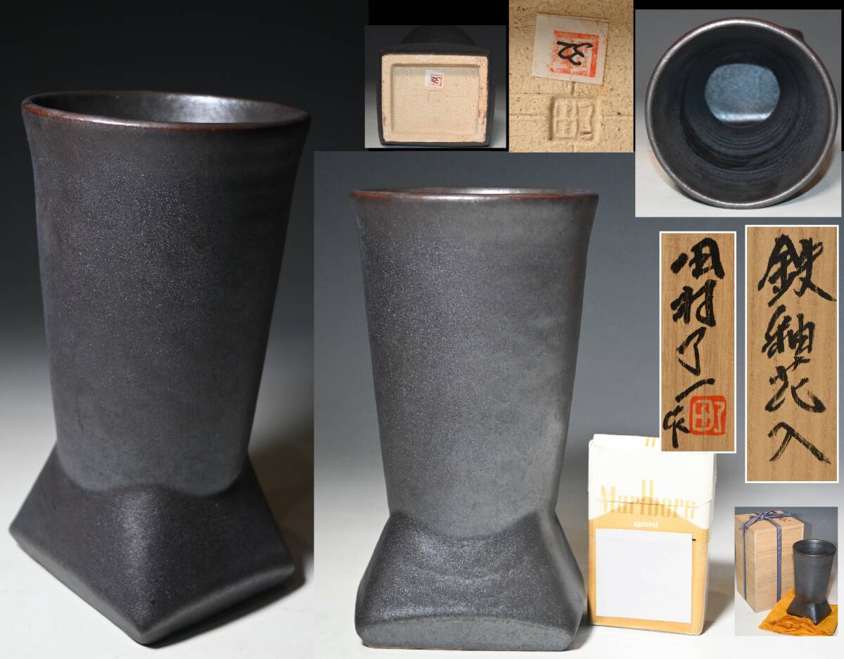 > 真贋保証■田村了一 作■ 鉄釉花入 共箱・共布 現代アート 高約21cm 父は人間国宝田村耕一 栃木県佐野市生 花瓶 花器 花生 モダン