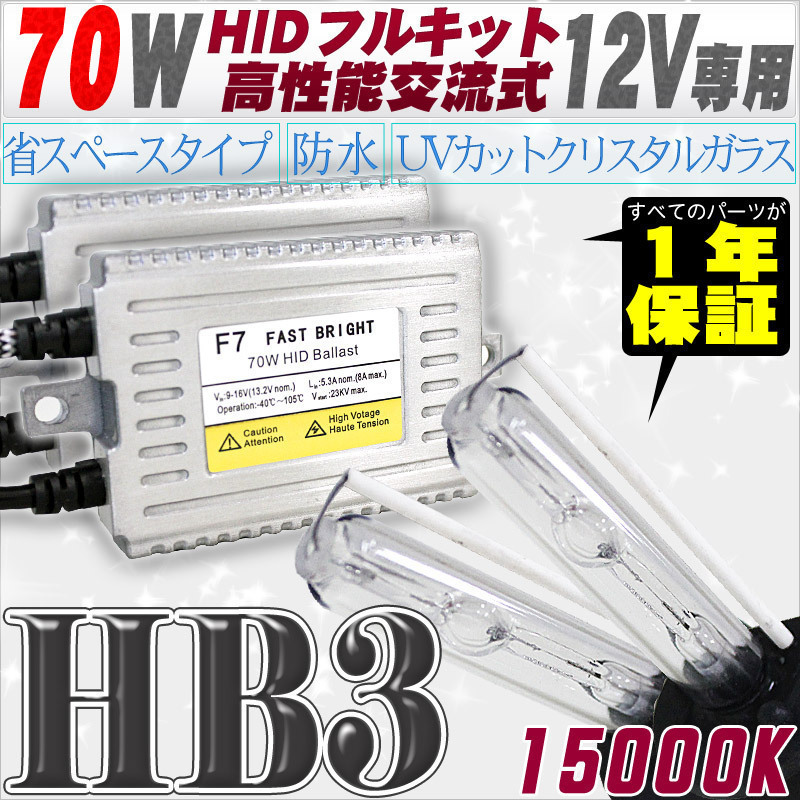 > 高性能 HIDキット 70W HB3 リレー付 15000K 【交流式バラスト&クリスタルガラスバーナー】 12V用
