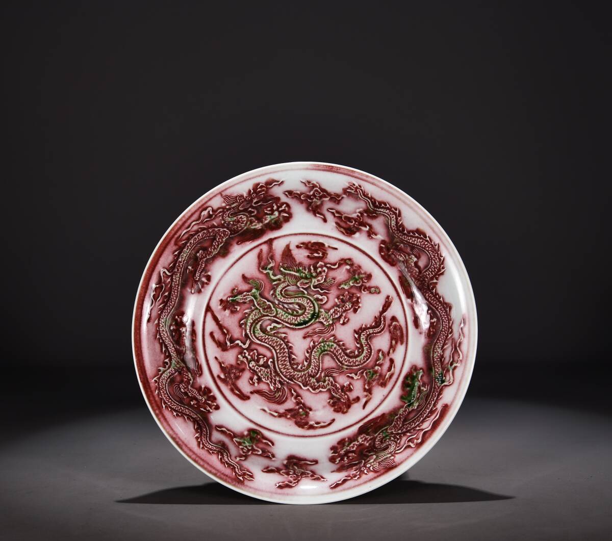 - ▽鴻▽ 明 永樂年制款 古陶瓷品 釉里紅 龍紋 供盤 陶藝 古賞物 古董品 時代物 稀少珍品 中国古玩 中国古美術