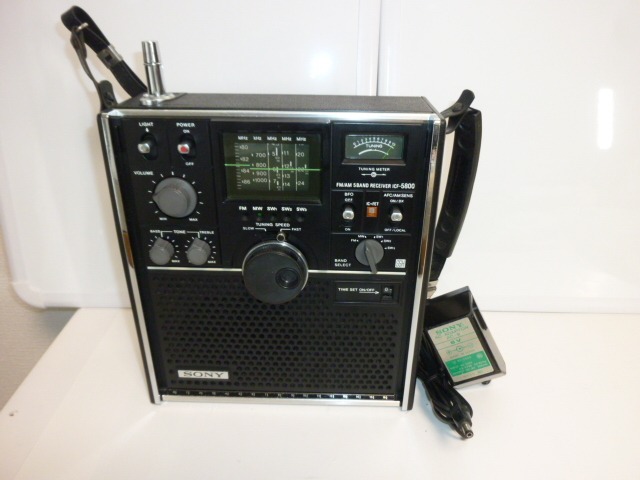 sony ICF-5800です。FM.MW.SW1-3の受信確認が出来ました。ロッドアンテナポップアップ、ライト、AFC、チューニングスピード切り替え、TONE調整、タイマー(ゼンマイ式の為正確性の保証は出来ません)OK。電池室もきれいです。付属品は純正のキャリングベルトとACアダプターになります。全体的に綺麗な状態ですが古い商品のため、擦り傷、汚れ、へこみ、サビ、受信感度低下、接触不良、チューニングメーターのズレ等が有る場合も有りますので、ご理解の上NC.NRで宜しくお願いします。発送は80サイズ元払いとなります。