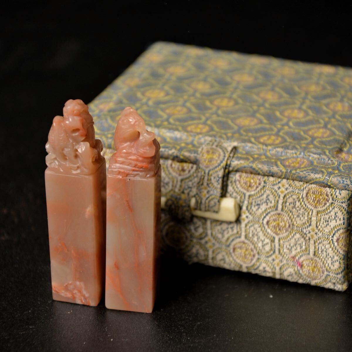 - 小舫 篆刻 寿山石 龍鳳対印 酔芙蓉 1980年代 印材 箱付 検:篆書 彫刻 印鑑 印章 書道 中国美術 古美術 文房四宝 田黄石 鶏血石 b0270