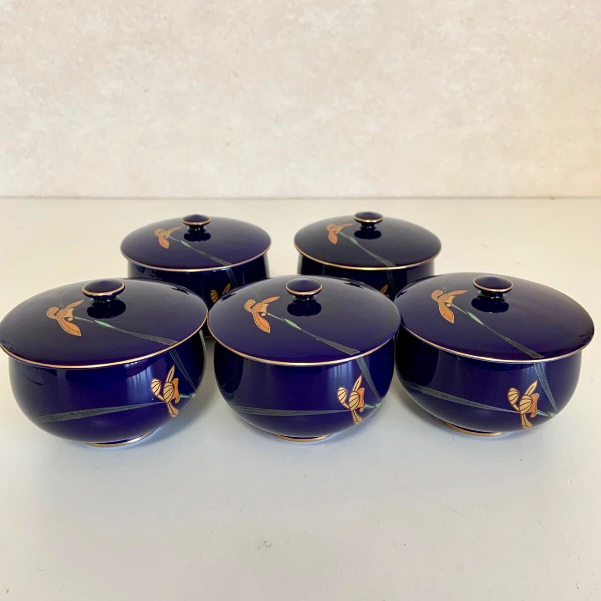 - 香蘭社 蓋付湯呑 5客 茶器 瑠璃色 菖蒲 金彩 蓋付き 湯呑み 和食器 未使用保管品