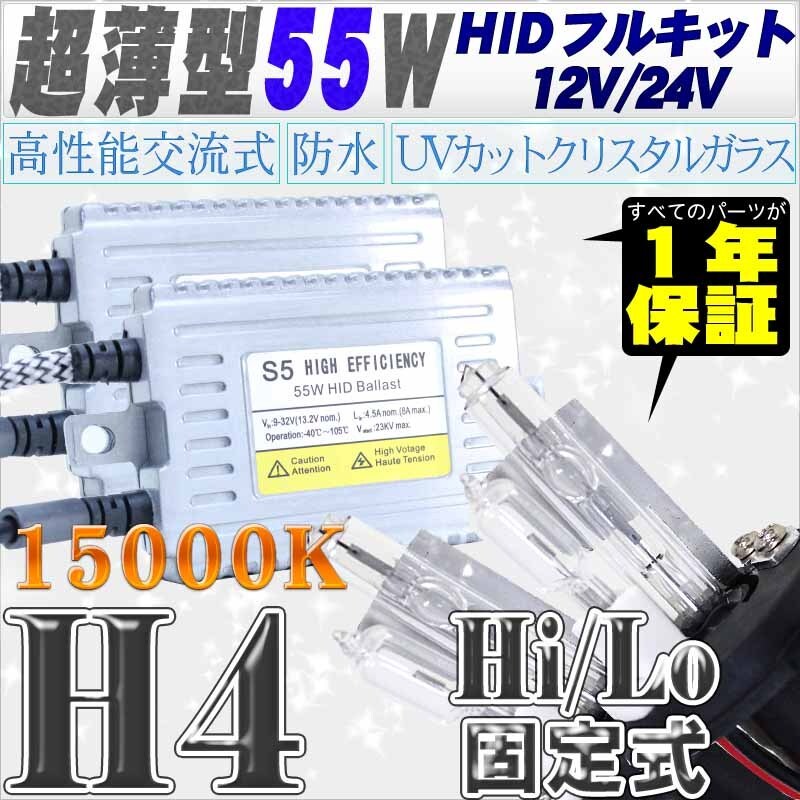- 高性能 薄型HIDキット 55W H4 Hi/Lo 固定式 15000K 12V 【交流式バラスト&クリスタルガラスバーナー】