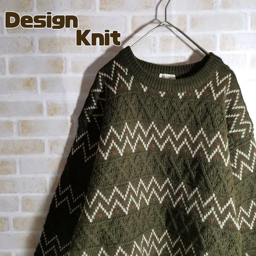 - デザイン ニット セーター カーキ オリーブ ケーブル 幾何学模様