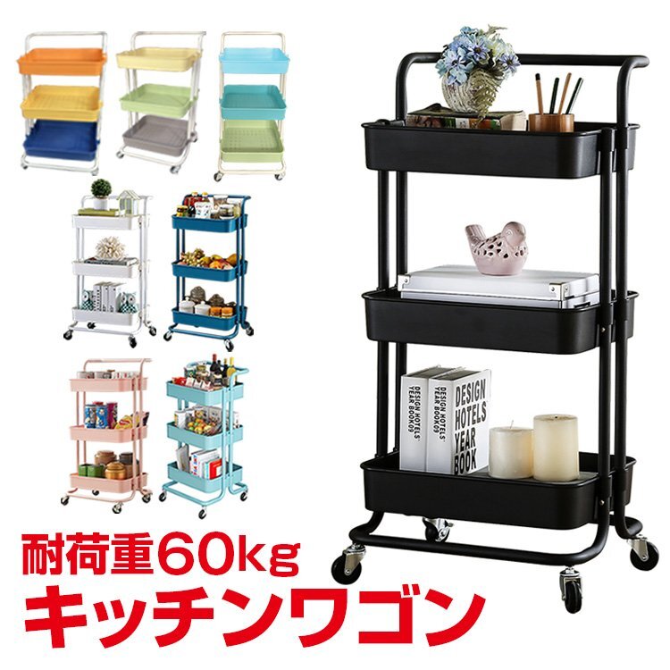 - 在庫処分 キッチンワゴン バスケットトローリー ツールワゴン キャスター付き ハンドル付き 3段 キッチンカウンター ny098-01-wh