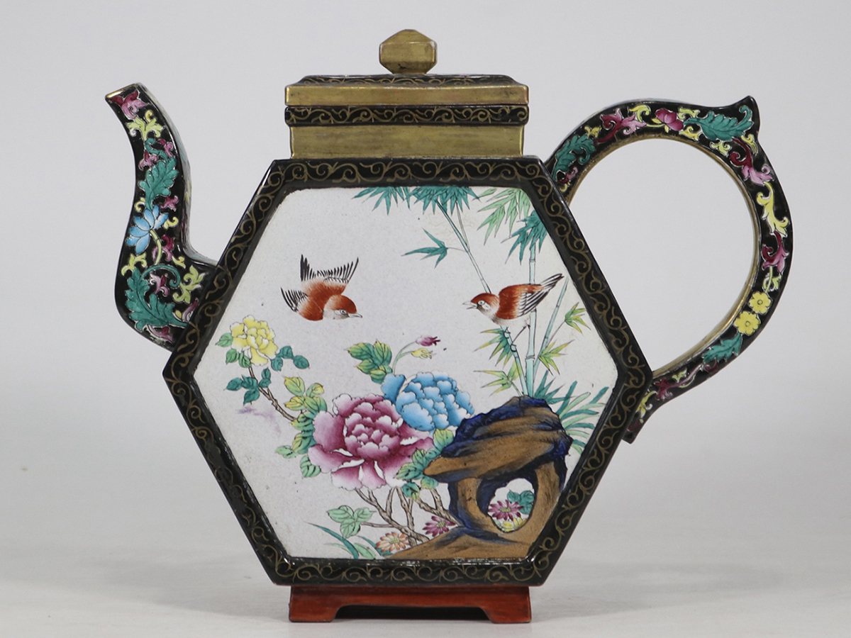 - ◆御泓軒◆『清時代 乾隆御製 琺瑯彩万花花鳥紋六方茶壺 宜興紫砂 常滑 朱泥急須 煎茶道具 茶壷』極細工・古賞物・中国古玩・中国古美術