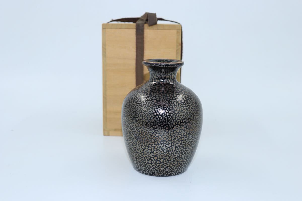 - [葉] 025天目佐々木禅 油滴釉掛花入 共箱 共布 栞 茶道具 本物保証