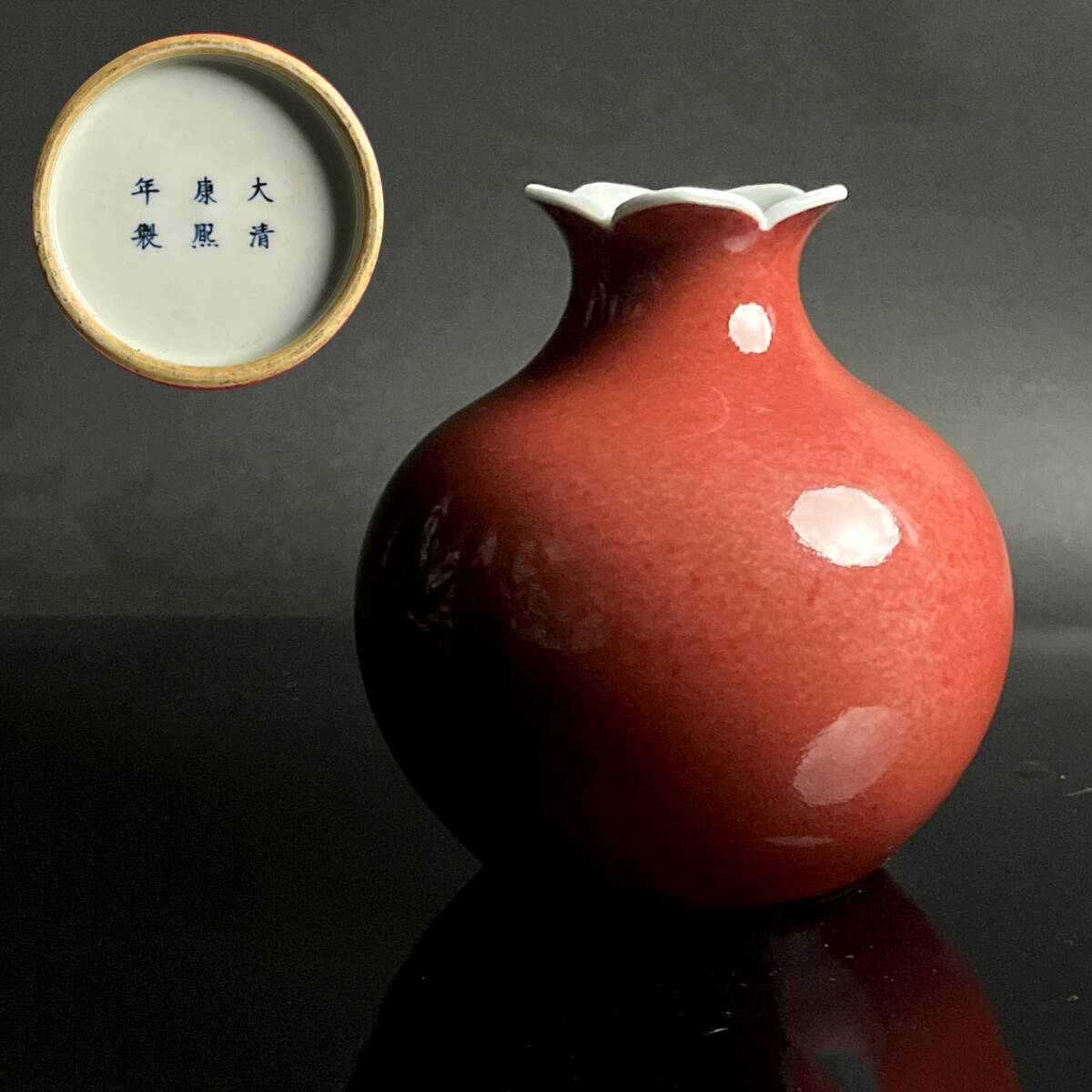 - 唐物 紅釉 辰砂 石榴形尊 大清康熙年製 款 中国美術 古玩 B6-63