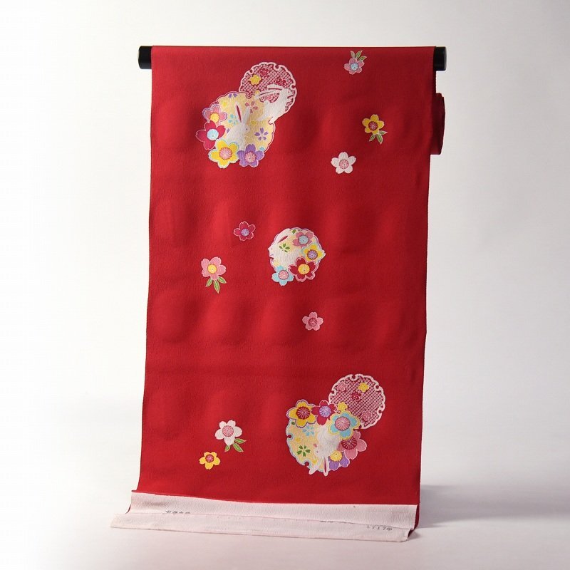 - 【ほりだし堂】 小紋 雪輪にうさぎと桜 赤色 反物 正絹 着物 着尺 大塚製ちりめん 女の子着物 四つ身に
