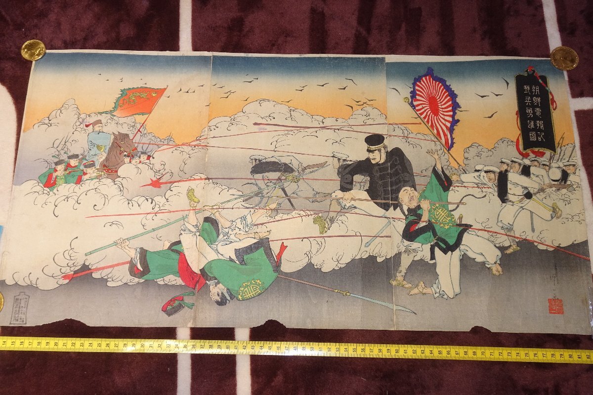 - rarebookkyoto 日清戦争錦絵・浮世絵木版画・藤原信一作・朝鮮電報記我兵勇進圖・三枚セット・秋山・明治・李朝 1894年 京都古物