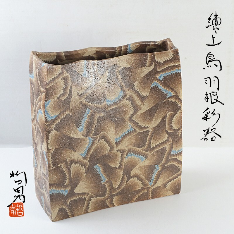 - 瀬戸焼 更紗窯 長江哲男作 練上鳥羽根彩器 共箱 CBZA