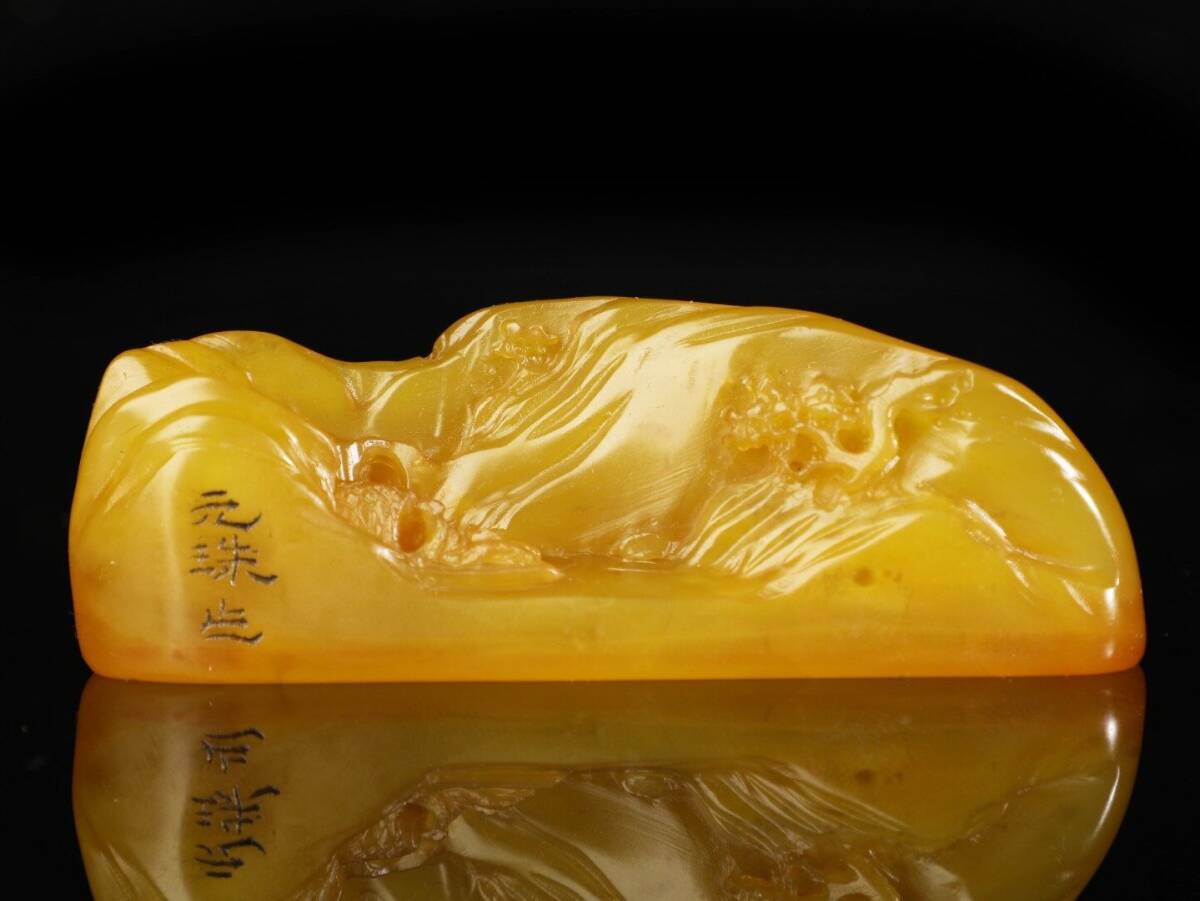 - ▽鴻▽清朝時代 寿山石 田黄石彫 山水人物紋文鎮 鎮紙 元珠作 置物 箱付 擺件 中国古美術 骨董品