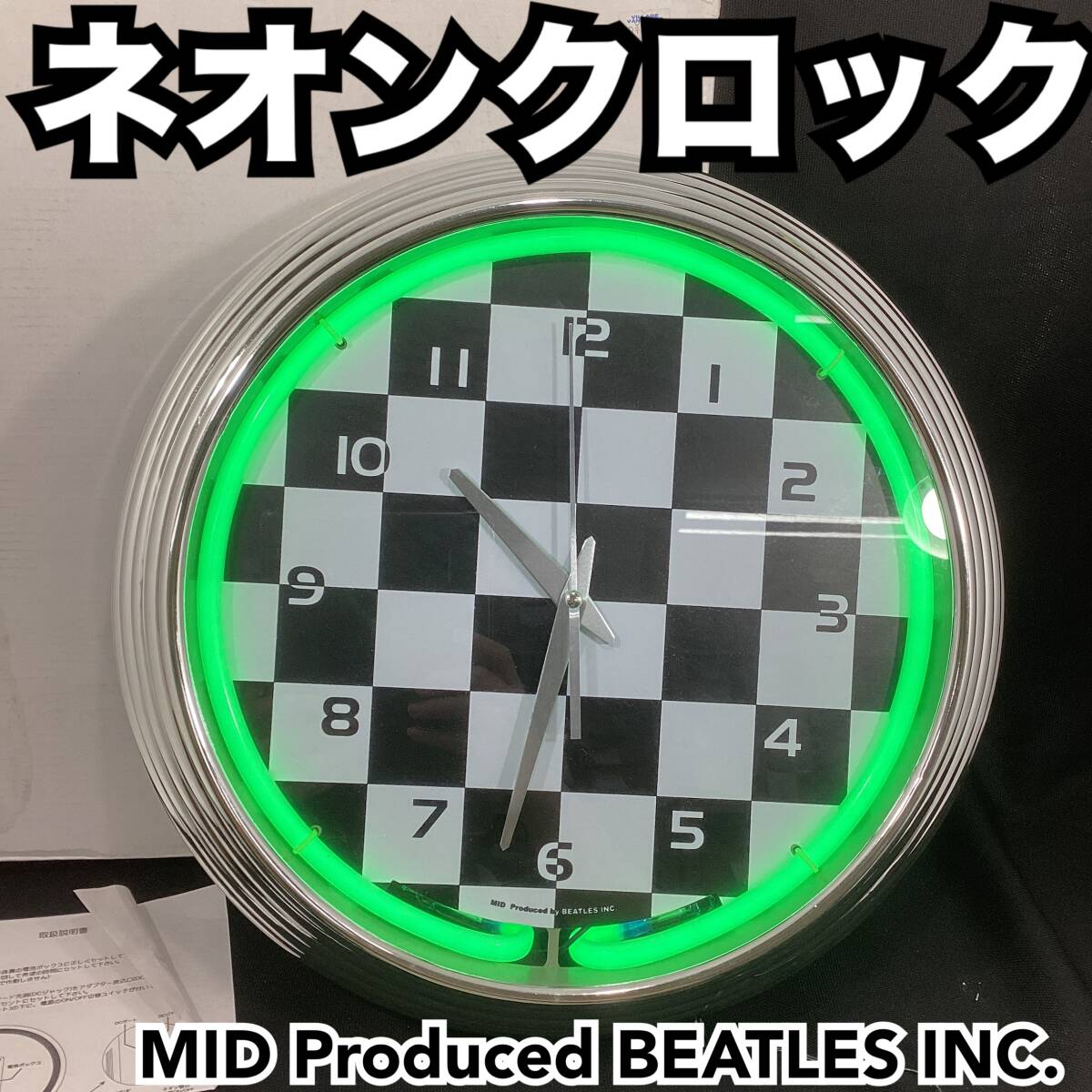 - 【未使用・長期保管品】BEATLES INC. ネオンクロック 緑ライト28043 白黒 ブロック 直径約38cm VILLAGE VANGUARD 動作確認済 (H1891)