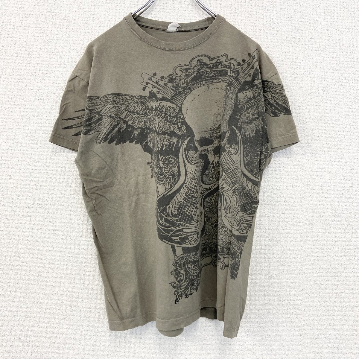 - 古着 used ノーブランド 半袖プリントTシャツ スカル エレキギター ロックデザイン クルーネック カーキ色 Mサイズ